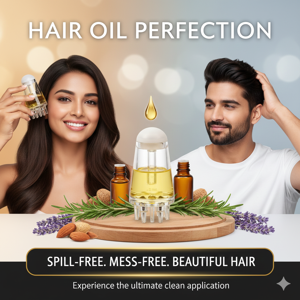 The 2-in-1 Hair Oil Applicator is designed to make oiling your hair simple, clean, and effective. It helps you apply oil directly to the scalp without using your hands, making the process faster and more comfortable.
