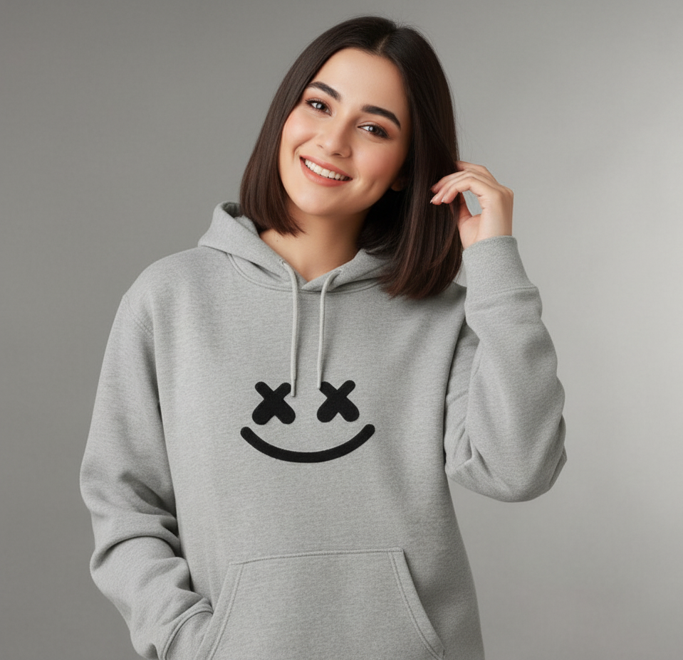 Step into the season with comfort and style that speaks volumes! This unisex grey smiley hoodie blends minimalist streetwear with playful energy — perfect for casual days, night-outs, or that effortless “cool” vibe.